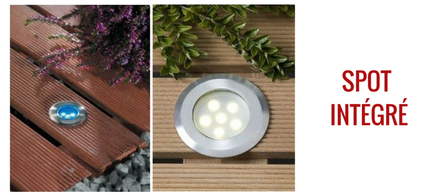 Les éclairages intégrés aux terrasses bois le sont souvent sous la forme d’un « balisage ». Servant à démarquer joliment un pourtour de terrasse, mettre en valeur un muret ou matérialiser une allée. Ils sont le plus souvent équipés d’ampoules LED de série. Dans certains cas, ils sont vendus avec des lampes halogènes ou à incandescence. Il est préférable de choisir des modèles dont on peut changer les sources lumineuses.